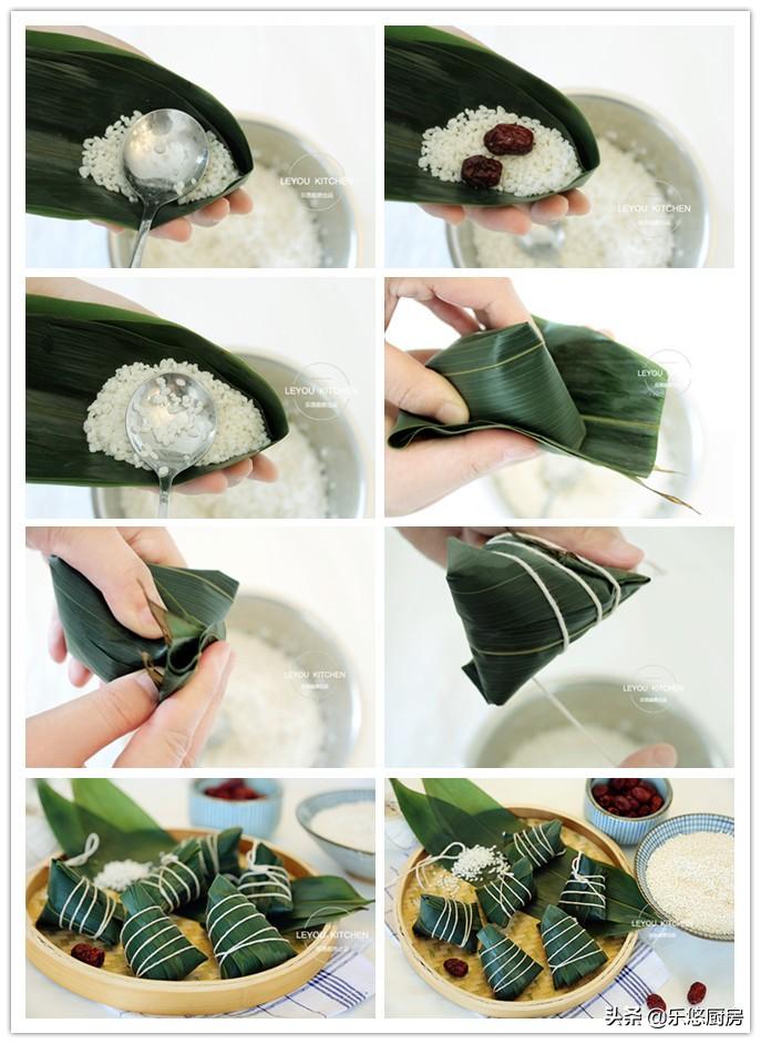 给大家介绍一种比较简单的四角粽包法,馅料是北方人喜欢的枣粽。这样包法的粽子形状好看,不容易漏米,也是最常见的粽子包法之一。