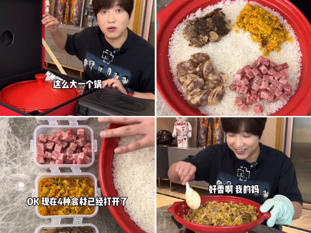 豪华板面引发网友热议的同时,“同系列出品”的,还有网红美食博主白冰品尝的外卖版“至尊煲仔饭”,用颇具仪式感的礼盒呈上,红色的煲格外“洋气”。除了一锅子米饭,煲内食材为手工香肠、和牛肉、蟹粉、白松露,售价1888元。