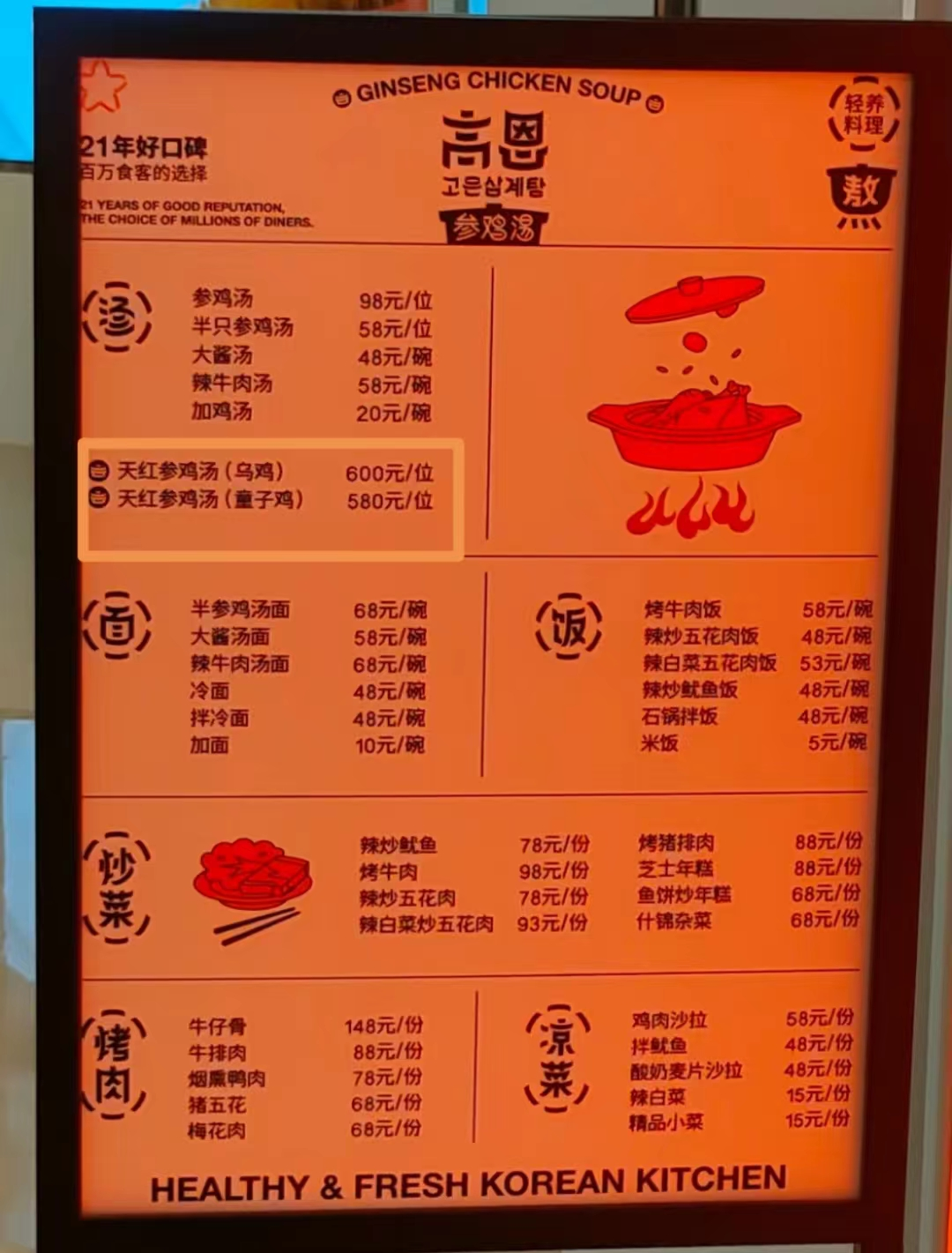 除了网红博主的分享,内参君还发现,一些餐厅悄然推出远高于客单价的“贵价单品”。在菜单中,这些菜犹如“鹤立鸡群”。比如北京有一家参鸡汤店,开在凤凰汇负一楼,常规的饭、面售卖价格在40-60元,却推出600元/位的天红参鸡汤。