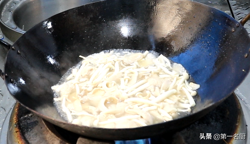 等水烧开后,下入蘑菇,焯水一分钟左右,倒出控水。