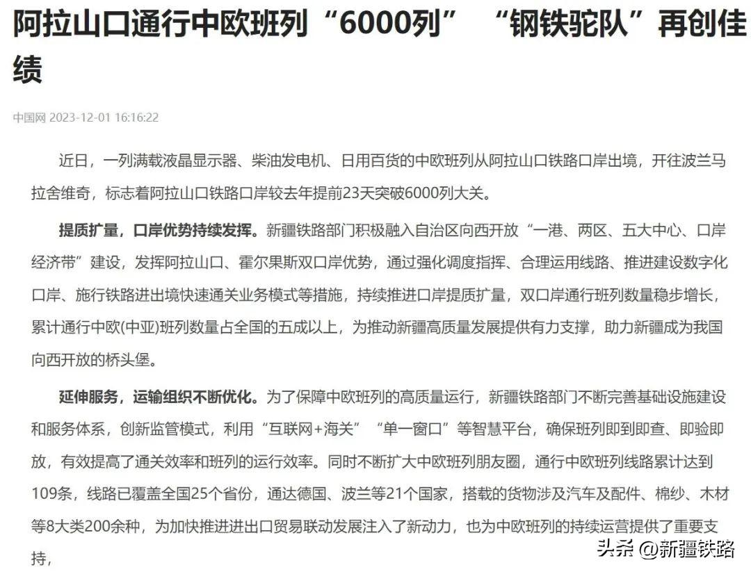 12月1日,中国网刊发工务机械段吴冠岑撰写的网评文章《阿拉山口通行中欧班列“6000列”“钢铁驼队”再创佳绩》。