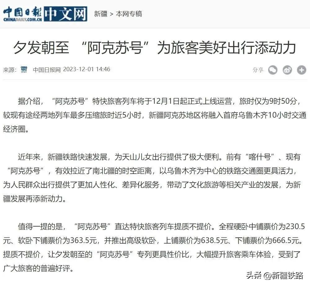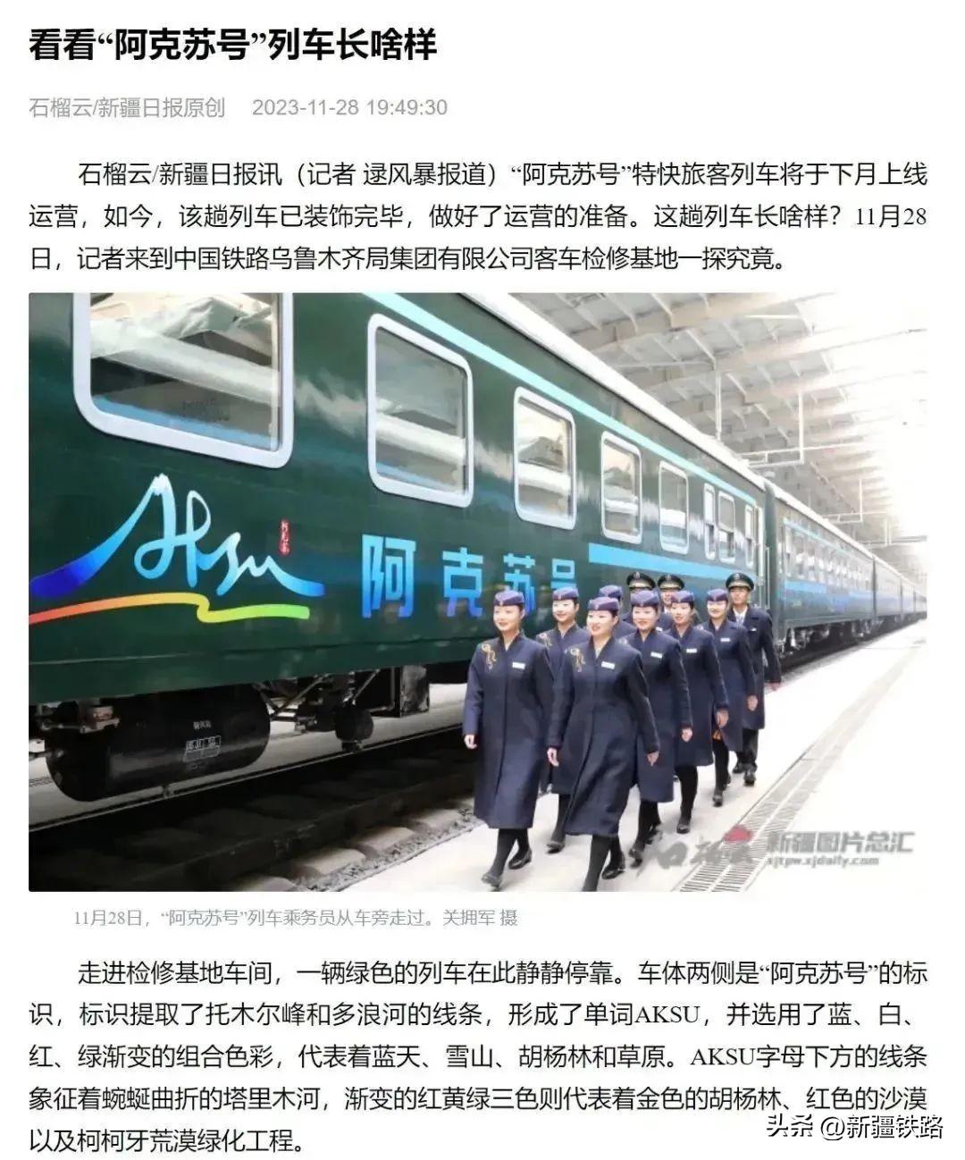 11月29日,央广网刊登《“阿克苏号”品牌特快旅客列车即将发运》,报道在新疆乌鲁木齐客车检修基地,整装待发的“阿克苏号”品牌特快旅客列车整齐排列在基地中,车辆、旅服、客运等部门已经做好了迎接旅客的准备。
