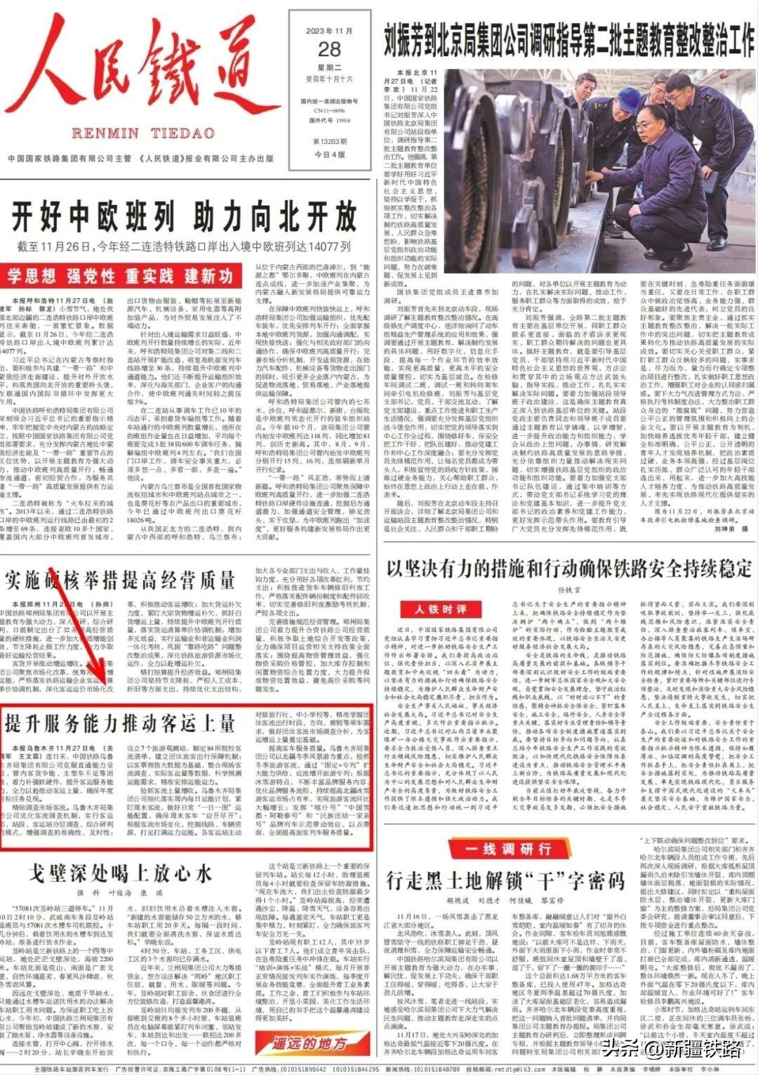 11月28日,《人民铁道》刊登《提升服务能力推动客运上量》,报道连日来,中国铁路乌鲁木齐局集团有限公司克服直通能力受限、管内客货争能、主型车不足等困难,着力补强软硬件,提升客运服务能力,全力以赴推动客运上量,确保年度目标任务兑现。