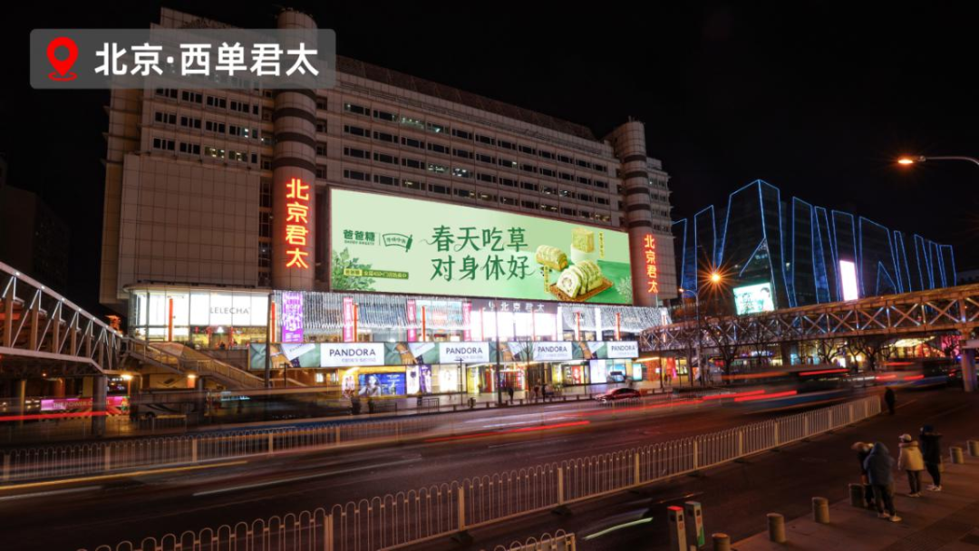 “9”指的是在北京、重庆、杭州、南京等9大城市,爸爸糖锁定热门商圈投放城市大屏。每块大屏少则几百平米,大到上千平米,效果震撼,整体青绿色的艾草图文信息格外醒目,行人纷纷驻足观看。