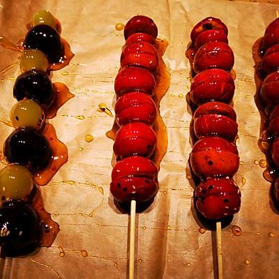 5、山楂串沾满糖,迅速放到烤箱用的油纸上面定型。