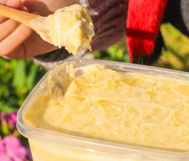 榴莲的品种也不含糊,选择泰国东部半山果园的金枕头榴莲,果肉天然甜度就很高,制作过程中完全没有加白砂糖,纯靠果肉能把人心甜化了。