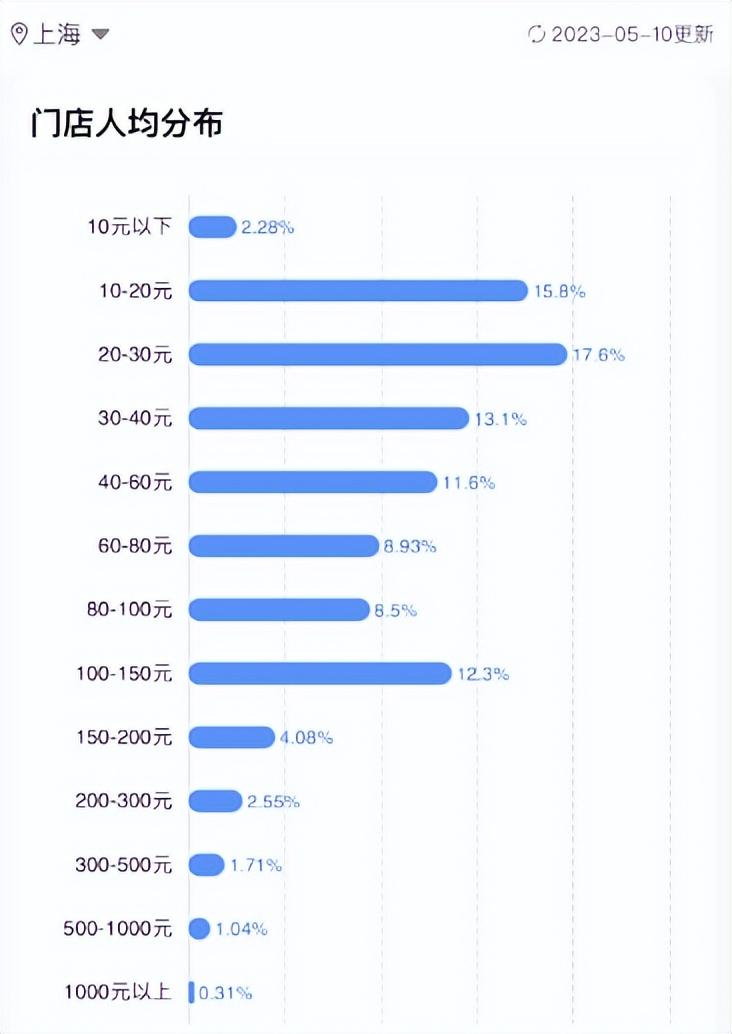 红餐大数据显示,截至2023年5月10日,上海在营的餐饮门店总数大约为201570家,其中人均客单价在500元以上的餐饮店占比1.35%,而人均客单价高于千元以上的占比0.31%。