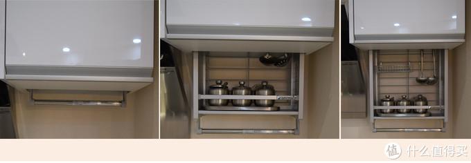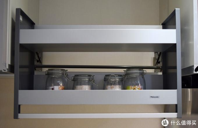 可以存放很多杂粮和罐子,很实用拿取特别方便,其实缺点也有和橱柜的抽屉一样,柜体两侧的五金需占用一定空间,因此要尽量买比较宽的拉篮,增加使用面积,然而升降吊柜越宽越贵,所以要狠狠砍价,让老板给优惠,要不这个真的舍不得买啊。