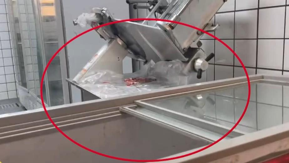 但在放置蔬菜的冰柜DV君留意到菜品是直接裸露在外摆放的旁边切肉机下方也残留着不少“冻肉”。