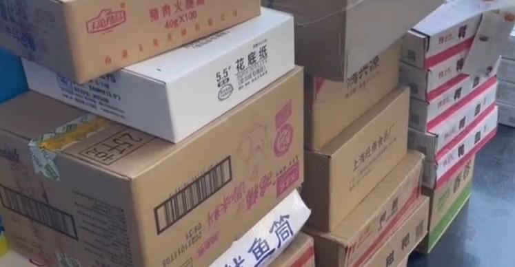 同一时间,记者发现多名店员正将一箱箱的食物搬运上楼靠近一看均为“鸭血”“鱿鱼”“肥牛”等冻品。