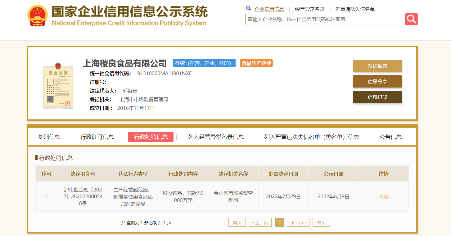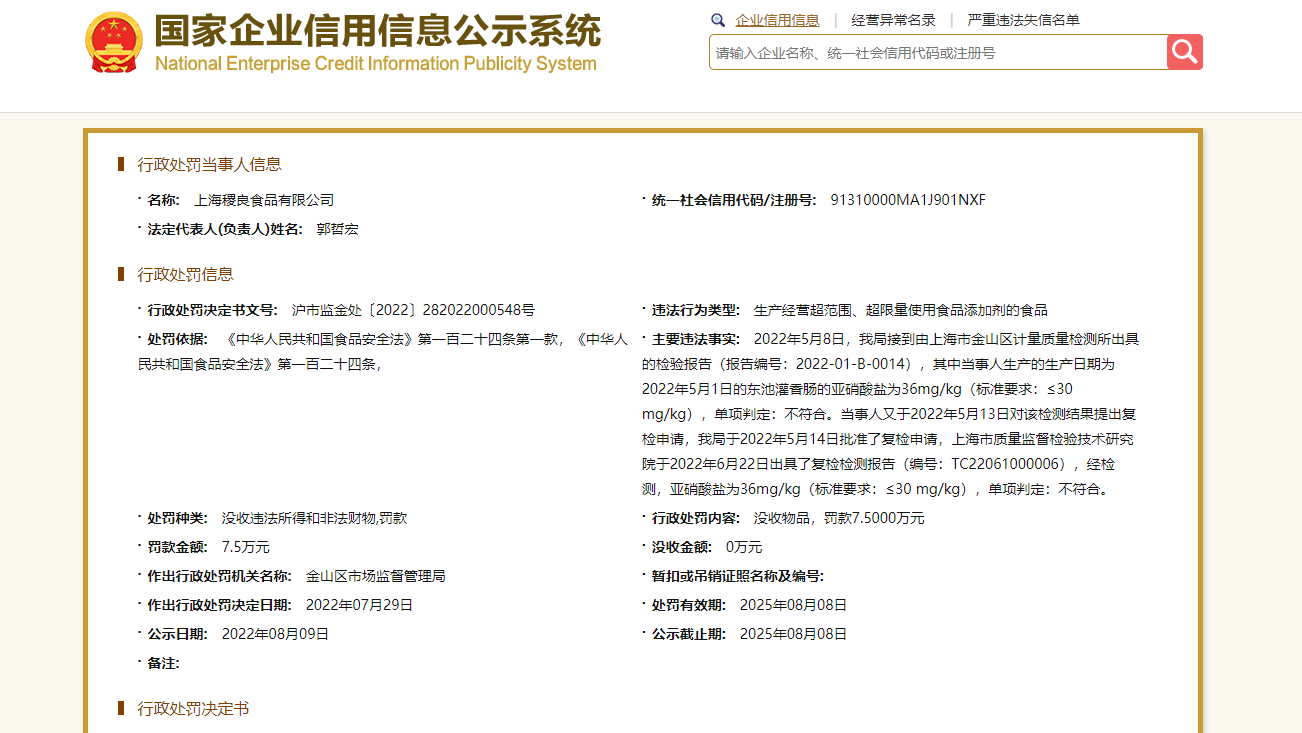 国家企业信用信息公示系统显示,上海稷良食品有限公司曾在2022年同样因其生产的“东池灌香肠”产品不合格被处罚。2022年5月8日,由该企业生产的“东池灌香肠”产品被检出其亚硝酸盐含量为36mg/kg(标准要求:≤30mg/kg),经判定不符合国家标准,上海市金山区市场监管局对其做出了相关行政处罚,罚款7.5万元。