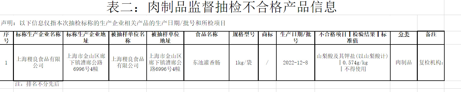 中近日,上海市市场监督管理局公布了2023年第16期省级食品安全抽检信息。据信息显示,本次抽检共涉及6大类食品,抽检样品共计545批次,合格541批次、不合格4批次,其中,不合格肉制品1批次。由上海稷良食品有限公司生产的“东池灌香肠”产品被检出含山梨酸及其钾盐(以山梨酸计)成分,不符合相关食品安全国家标准。