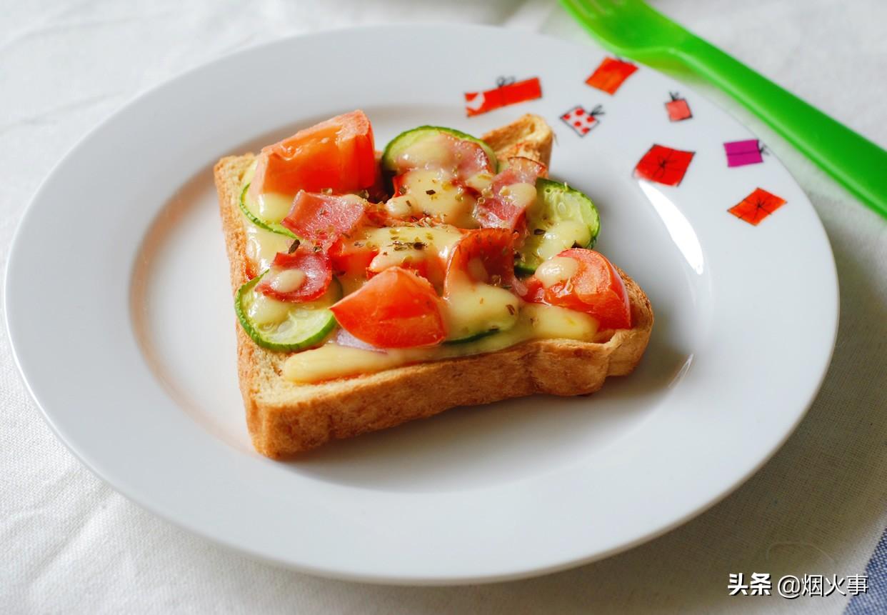 2、这个版本只是个例子,只要具备了吐司、奶酪、和番茄酱(披萨酱),你想吃什么口味的:金枪鱼、火腿片、豌豆、玉米、虾仁等等,冰箱里有什么存货你就随便拿来放。