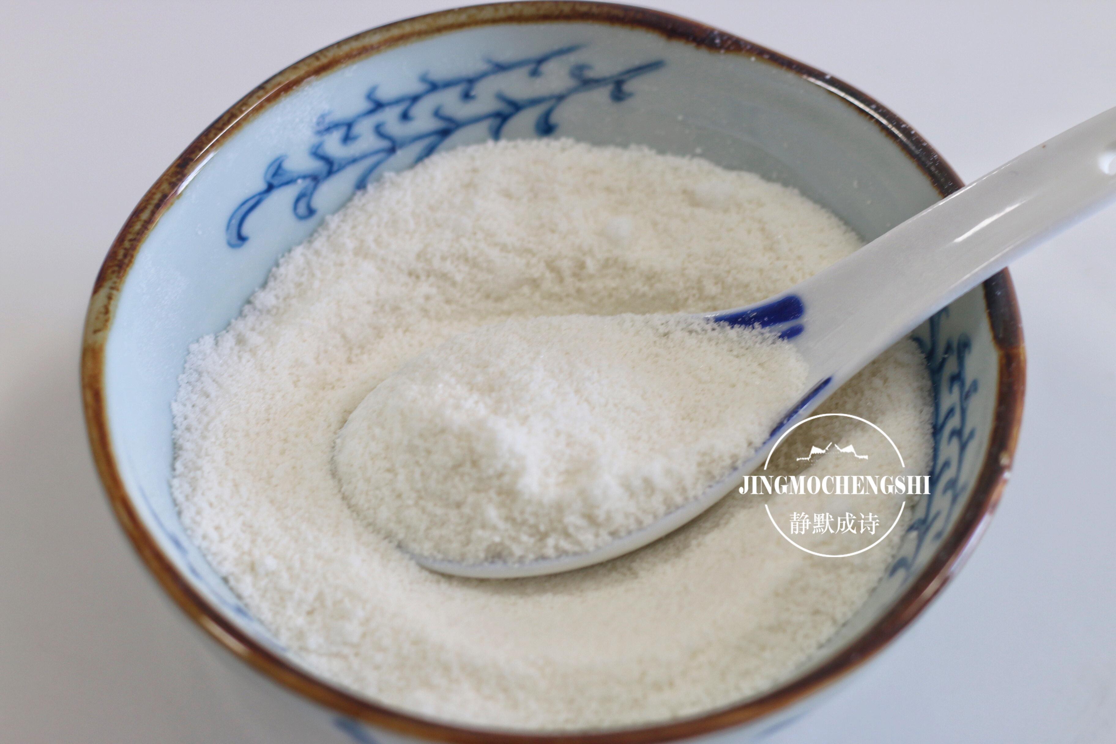 6、蒸黄米面的同时,我们来调白糖馅儿:白糖中加入面粉,搅拌均匀,这样的话,白糖馅儿就不会流出来了,只用白糖的话,油炸糕容易炸裂开流出糖汁。