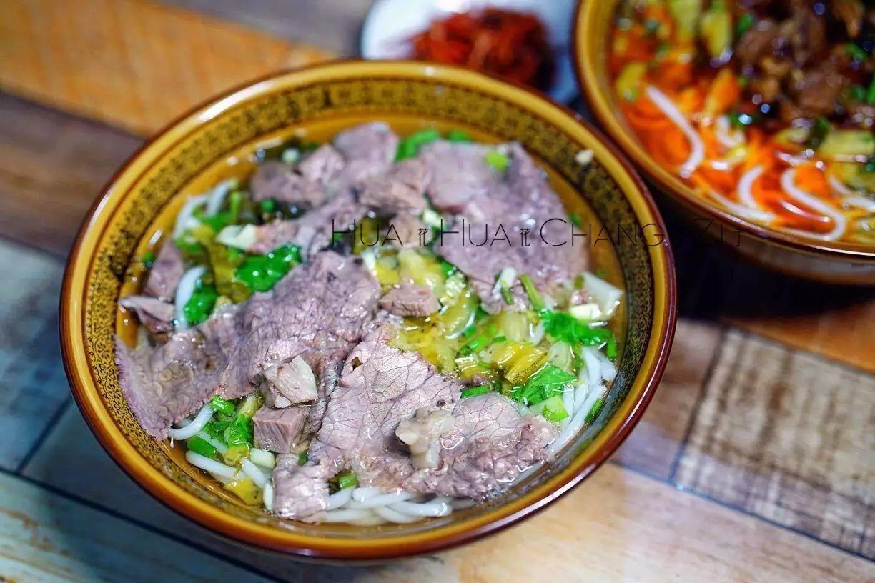 店主是兴义人,他家的铜锅牛肉很兴义!牛肉选用的是平坝的骟牛,因为是回族,杀牛也很有讲究,必须用经过阿訇(hong)宰杀的牛现运来。每天早上8点到下午3点,店内经营着兴义清镇牛肉粉面,有清汤和红烧两种,汤底每天现熬。