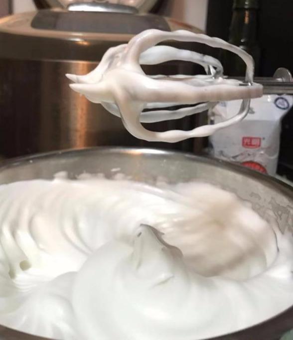 5.打到蛋白有光泽,有清晰的纹路,拉出小尖头,蛋白呈水平线不下垂就可以啦