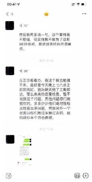 但其目的并非纠正这些餐饮店铺的规范经营,而是为了在举报后将举报单截屏,随后与该商家取得联系,指出他们存在违规情况,并称自己“已举报,如果想要让我撤销,就要付出数千元的好处费”。
