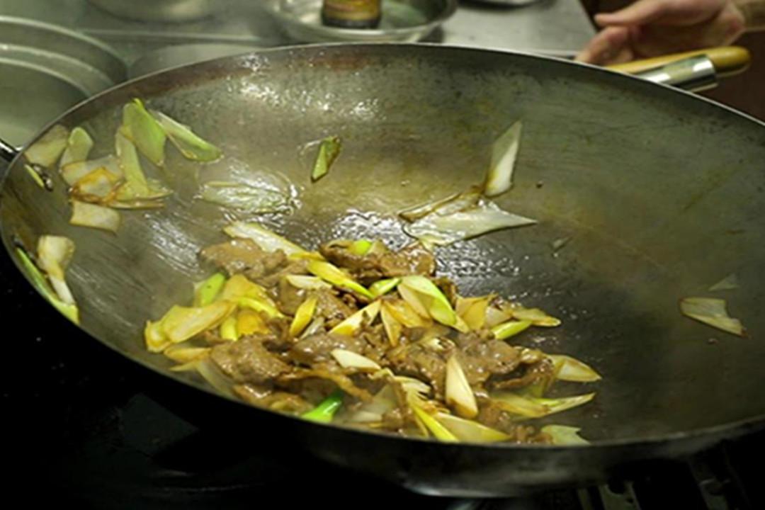 4.锅内留底油,放入葱段小火翻炒香,闻到香味以后立马加入生抽、放入肉片,大火快翻让葱香和肉香充分融合。
