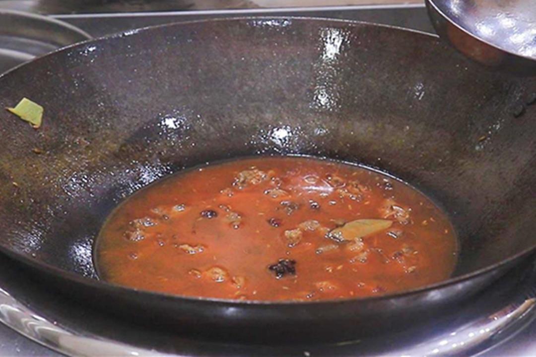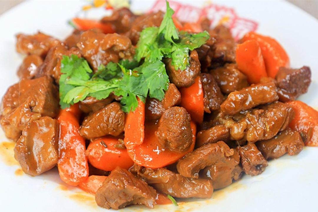 5.30分钟以后捞出锅中的香料不要,放入胡萝卜继续炖5分钟,胡萝卜炖熟后加入鸡粉2克、蚝油5克补味,转大火把汤汁收浓,最后撒上香菜美味即成。