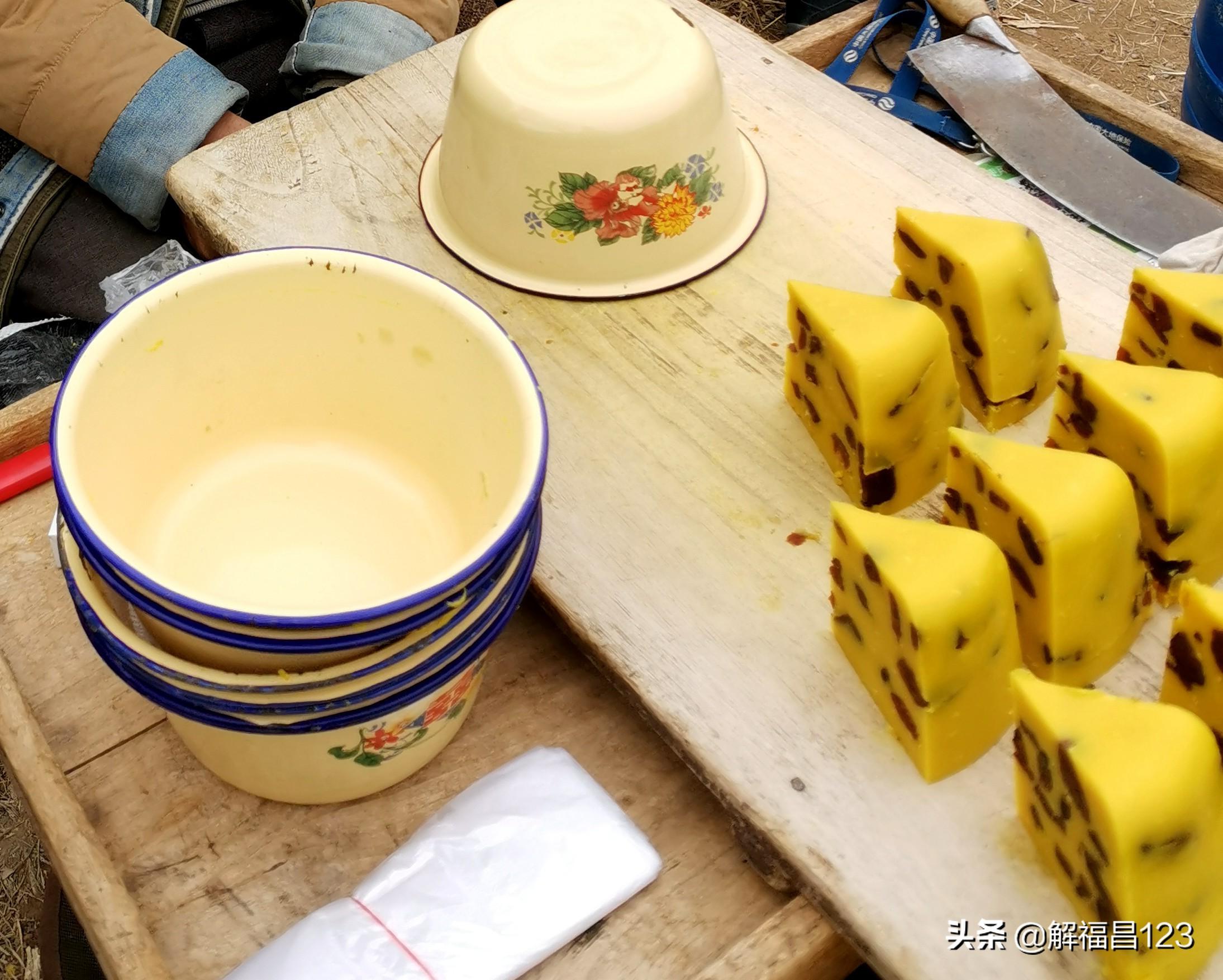 图为盛豌豆糕的盆和切好的豌豆糕。