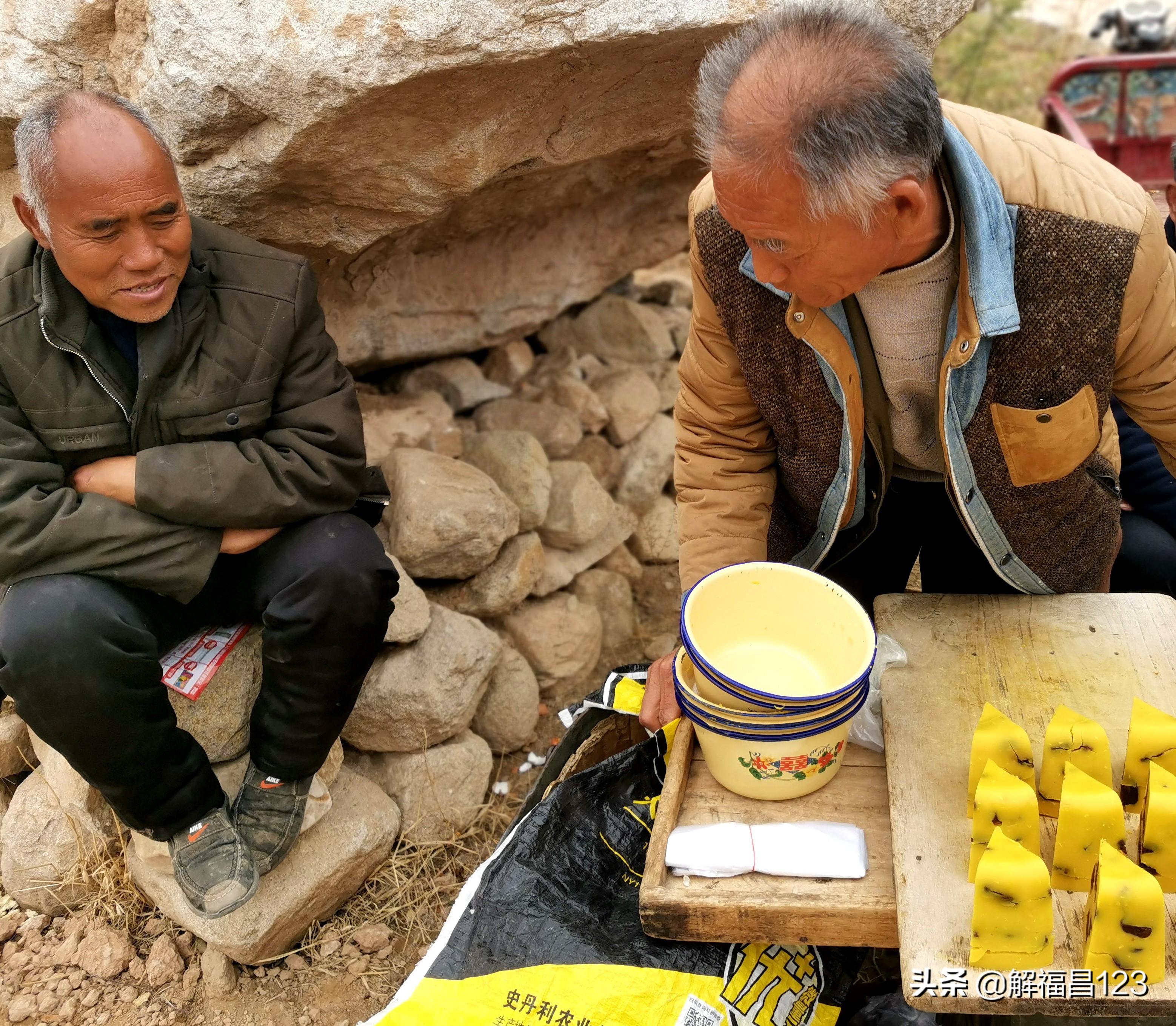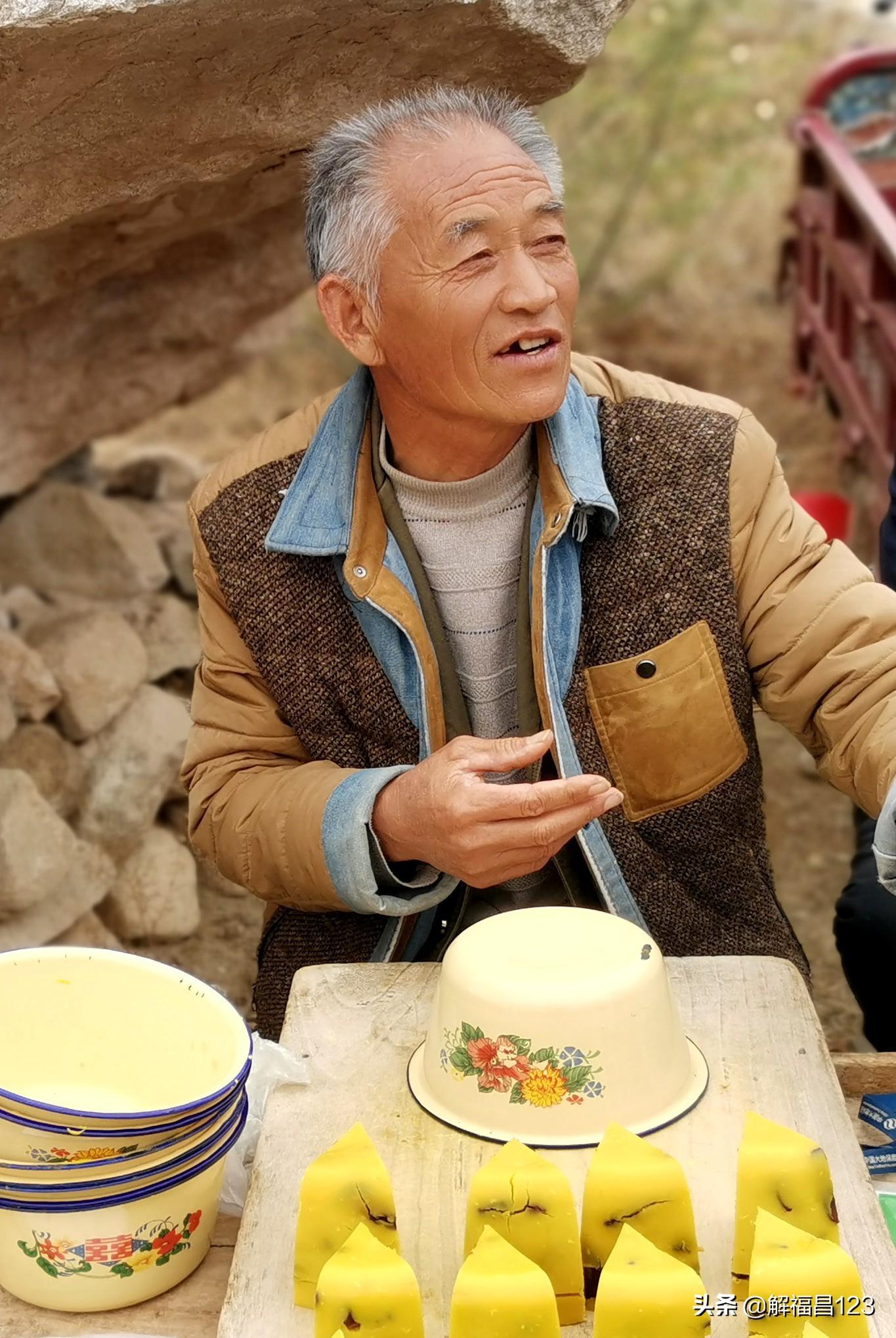 在一个地方的节日里,看到一位大叔正在卖豌豆糕,这位大叔姓薛,今年六十岁了。他的家住在大山的下风口,一年四季都有大风天天吹,为了不把瓦房上面的瓦吹落,这里的农民都会在瓦房上面压上石头块。由于这个地方是个下风口,所以,春季这里的苹果花、梨花、杏花都容易冻掉,农民的收成没有保证。大叔家里有四十亩地,一个儿子外地打工,一个儿子和自己在家里种地。由于受到大风的干扰,苹果花三年两头冻,收入非常有限。于是老薛就开始卖豌豆糕。