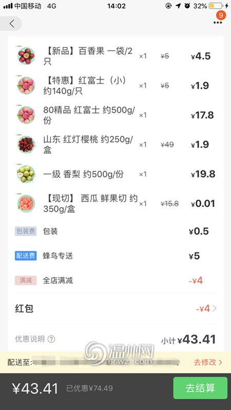莹莹是一名大学生,平常爱点外卖的她,也喜欢在外卖平台购买水果。莹莹表示,通过外卖平台买水果主要是因为方便。她也是偶然发现,使用了满减、红包等优惠后,有时会比店里更便宜。随后,记者打开某外卖平台搜索了此前买过水果的诚信果林店,发现平台上的单价偏高一些,富士苹果价格为15.8元一斤,香梨为19.8元一斤,但店内满减活动和较多优惠产品,如特惠红富士(小)仅售1.9元一只,樱桃仅售1.9元一盒。记者下单了一斤红富士、一斤香梨、一袋百香果、一盒樱桃及一只特惠红富士,使用各种优惠后共需要43.41元,价格还算实惠。