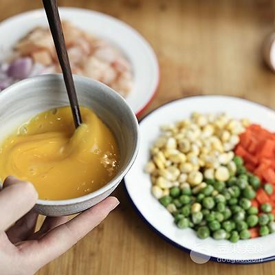 1、准备食材:冷饭、玉米粒、豌豆(提前焯水3分钟)、洋葱粒、胡萝卜粒、阿根廷红虾仁切块、鸡胸肉切块。