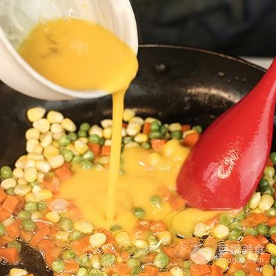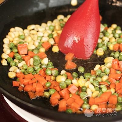 3、热锅下油,放入各种蔬菜粒。翻炒2-3分钟。